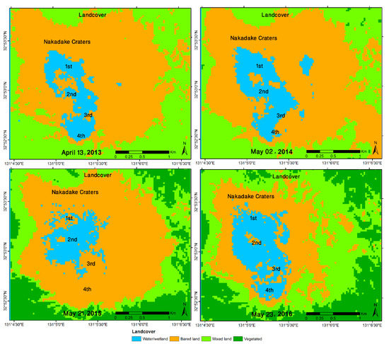 The Landsat 8 TIRS sensor was used for the first time for estimating heat losses from the Aso volcanic area to evaluate the recent thermal activity from 2013 to 2016 using four sets of images. In the first stage, the OLI sensor images of Landsat 8 were used for computing the vegetation index (NDVI) values of this region, which was used later to map land cover. The NDVI value is divided into four categories for different land cover types: fully healthy vegetated (NDVI > 0.5), mixed land (NDVI = 0.2–0.5), bare land (NDVI = 0–0.2), and water or wetland (NDVI < 0). The NDVI value was also used for emissivity estimation of this study area using the NDVI-threshold method (Figure 3). NDVI results showed that the vegetated area increased from zero to about 9.37 sq. km of the study area from 2013 to 2016, as bare land was reduced by about half, to 21.49 sq. km, from 2013 to 2016 (Table 1; Figure 4). On the other hand, for certain land cover types, namely, water and mixed land, the area was the lowest in 2015. Emissivity was estimated for the two thermal bands of TIRS sensors separately using the NDVI-threshold method. The results showed that the values range from 0.92 to 0.99. A higher value indicates water or bare ground, and the vegetated region shows a low value of emissivity in this region. The atmospheric transmissivity values were calculated for the Landsat TIR Band 10 and Band 11 using ambient temperature and relative humidity percentage of the Aso volcanic area during the time of image acquisition. The atmospheric transmissivity value ranges ca. 89–95% for Band 10 and 84–92% for Band 11 during the study period (Table 1).