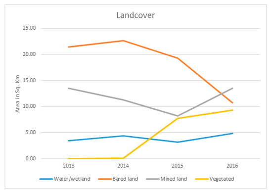 The land cover maps of the study area from 2013 to 2016, derived from the NDVI values for healthy vegetated area, mixed land, bare land, and water or wetlands.