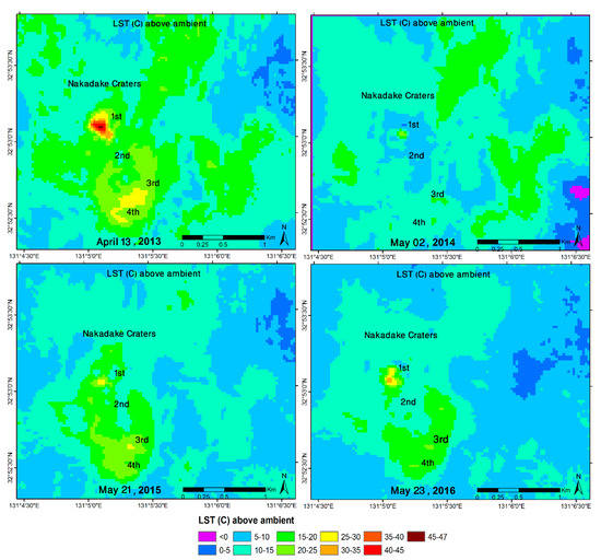 - As the thermal anomaly was mapped as higher in 2013, with respect to both LST and RHF, there was no healthy vegetation or vegetated coverage of any pixel area in this region, nor was there any vegetation in the stress stage showing as a mixed land area. An NDVI value above 0.5 indicates a healthy vegetated area. Another reason there was no vegetation coverage in 2013 might be the spatial resolution (30 m) of the image used in this study. There might have been some healthy vegetation in 2013, but the area would have been lower than the spatial resolution of the images, so the pixel would have appeared as a mixed area pixel. With the decline of LST surrounding the crater, greater vegetated coverage area was found after 2013. The area of bare land as well as the LST had declined from 2014 to 2016 in some parts around the Nakadake crater. After 2015, the bare land area declined and the mixed area increased, indicating the lower LST surrounding the crater.