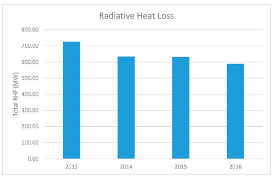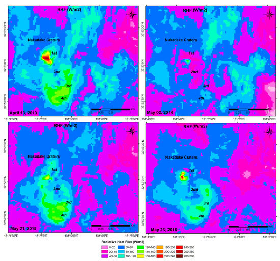 Radiative heat flux (RHF) was computed using the Stefan–Boltzmann equation of heat transfer considering the calculated emissivity, atmospheric transmissivity, and ambient temperature taken from the nearest AMEDAS meteorological station (ASO San). RHF was estimated separately for the TIRS Band 10 and Band 11. Later on, the pixel-based average RHF value was computed using the estimated RHF value for Band 10 and Band 11 of the study area. The highest maximum pixel RHF, ca. 289.92 W/m2, was obtained in 2013, and the lowest maximum RHF, ca. 141.25 W/m2, was found in the following year, 2014, but this increased gradually to 177.92 W/m2 and 221.58 W/m2, respectively, in 2015 and 2016 (Table 1; Figure 6). The total radiative heat loss (RHL) was computed after the summation of the RHF positive values of the study area from 2013 to 2016. The highest RHL, ca. 726.49 MW, was obtained in 2013, and the lowest value, ca. 588.43 MW, was obtained in 2016; i.e., there was an overall declining trend from 2013 to 2016 in the Aso volcano area in Japan (Table 1; Figure 7). The total heat discharge rate (HDR) was computed after multiplying the total RHL using a relationship coefficient (i.e., 6.49) between RHL and HDR based on previous studies [11,13]. Thus, we obtained the highest total HDR, ca. 4714 MW, in 2013 and the lowest total HDR, ca. 3819 MW, in 2016 (Table 1).