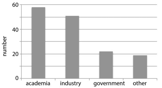 Our aim was not necessarily to target every geoscientist in Canada, but rather to get a cross-section of the community, both those currently working in it as well as retirees and students. Figure 1 shows the distribution of the background and work experience (or student background) for the respondents. Whereas the number of completed responses was 123 in total—very small compared to the estimated 20,000 Canadian professional geoscientist [], and possibly biased towards those individuals who have encountered ethical issues—the data provide a balanced cross-section of government, mineral, environmental, and petroleum sectors, as well as academia (both faculty and students) and retired geoscientists. According to the affiliations participants provided as answer to one question we note that they hail from across the country, that is Atlantic Canada, Ontario, the Prairies, Western Canada and the Territories.