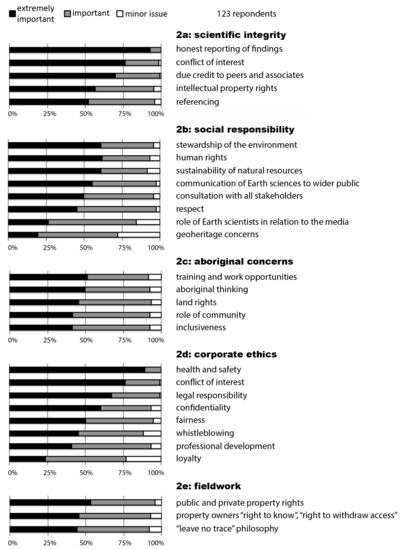 In terms of issues surrounding scientific integrity (Figure 2a) all of the listed criteria were considered important or extremely important by more than 96% of respondents, with honest reporting receiving the highest ranking in terms of extreme importance (93%) and referencing receiving the lowest in terms of extreme importance (but still with 52% considering this extremely important). One respondent suggested that we also include “cooperation and communication between geoscientists, especially relating to application of best-practice science” and “application of continuing education for practicing professionals”. We agree that these are additional considerations, and speak to the need for greater intra-professional communication and the importance of ongoing professional development, both of which may well contribute to good ethical behaviour.