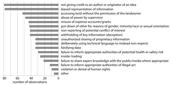 In addition to inviting respondents to consider what they thought to be important within the selected categories, we shared a list of potential areas in which ethical considerations might arise, and asked them to identify all from the list that they had personally observed in an Earth sciences context, while clarifying that the question was not asking them to reveal whether they were directly involved, simply whether they had ever encountered any of the considerations presented. In other words, this question moved beyond what individuals thought to be important to what they observed as violations of potentially important ethical considerations. We also invited participants to add other potential considerations to the list that we might have missed. The results are shown in Figure 3. This list includes criteria from all five of the categories we targeted, as outlined previously. We also included: negative comments about Canadian Earth science sector within Canada; and negative comments about Canadian Earth science sector abroad; but excluded them from Figure 3. As in Figure 2 we re-sorted the considerations according to how often they were selected. With the exception of observing human rights and legal violations (which were identified by 7% and 10% of respondents respectively), all other considerations were identified by more than 17% of respondents. Close to 80% of respondents noted that they had observed biased representation of information and lack of assigning credit to authors or originators of ideas.