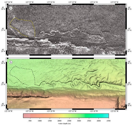 (a) GLORIA (6.5-kHz sidescan sonar) backscatter image of the eastern portion of Mendocino Channel, modified from [5]; (b) Multibeam bathymetry of same area. Dashed line (yellow and black) outline area of high 6.5-kHz backscatter in area immediately north of crevasse splay (see text for discussion). Location slightly larger than rectangle labeled “Fig. 10” on Figure 2.