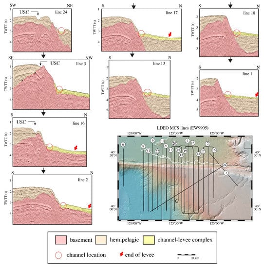 Multichannel seismic-reflection profiles (EW9905) collected by Tréhu et al. [25] and accessed at www.geomapapp.com. TWTT is two-way travel time. Red circle surrounds location of Mendocino Channel; red arrow is location of the distal end of the levee. Large black arrows show the progression of seismic lines from east to west. No channel was resolved on lines 6, 8 and 23. USC is upper side channel (see canyon discussion below).
