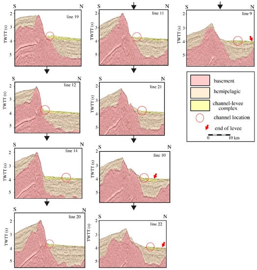 The regional bathymetry suggests the southern boundary of Eel Fan is just to the north of the new MBES bathymetry. Tréhu et al. [25] reported on a series of N-S multichannel seismic profiles that cross a section of Gorda Escarpment that includes Mendocino Channel. The profiles (Figure 4) show that Mendocino Channel is perched against the north wall of Gorda Escarpment and has constructed a levee to the north, overlapped in places by landslide deposits and buried in other places by distal sediments of Eel Fan. The channel-levee complex is more than 250 m thick in places and was deposited above a thick deformed hemipelagic sequence that probably represent sediments of Eel Fan as well as landslide deposits.