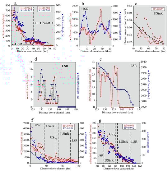 Plots of relationships between (a) upper straight reach (USR) and upper sinuous reach (USinR) levee heights vs. distance down-channel. Curly black bracket is gap in USR north levee heights in an otherwise smooth decrease and curly white bracket is gap in USinR north levee heights; (b) USR channel floor width and channel top width vs. distance down-channel; (c) plot of USinR channel cross-sectional area vs. distance down-channel; (d) plot of LSR levee heights vs. distance down-channel; (e) plots of LSR perched height above basin depth and depth of channel floor vs. distance down-channel; (f) plots of entire Mendocino Channel floor width and channel incision depth vs. distance down-channel. Curly bracket is gap in channel width and depth with down-canyon distance; (g) plots of entire Mendocino Channel perched height above basin depths and levee height vs. distance down-channel.