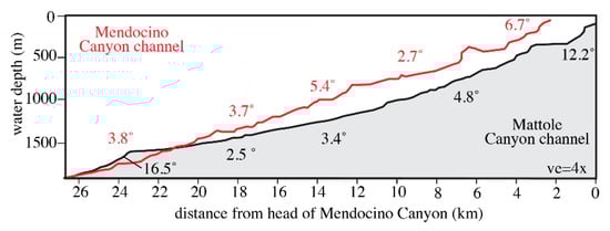 Thalweg profiles of Mendocino Canyon channel (red) and Mattole Canyon channel (black). Note the rough and subtle concave-down profile of Mendocino Canyon channel relative to the smooth but stepped distinct concave-up profile of Mattole Canyon channel.