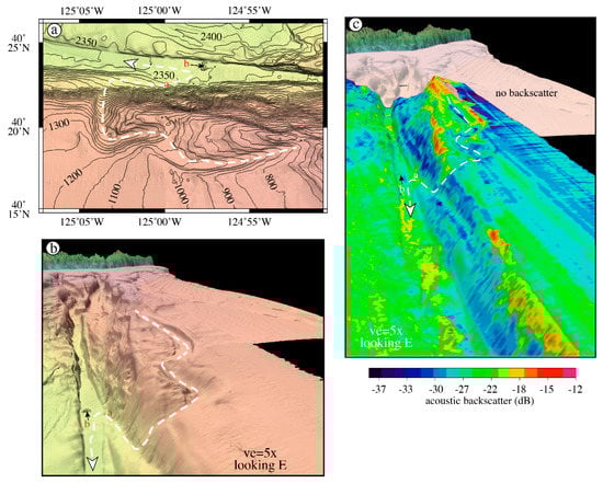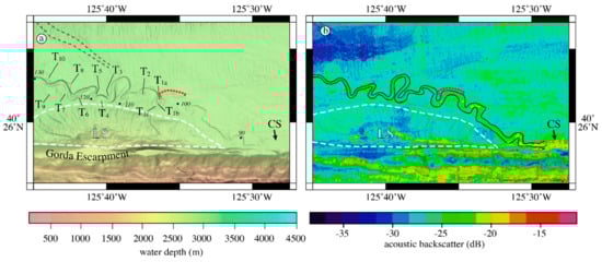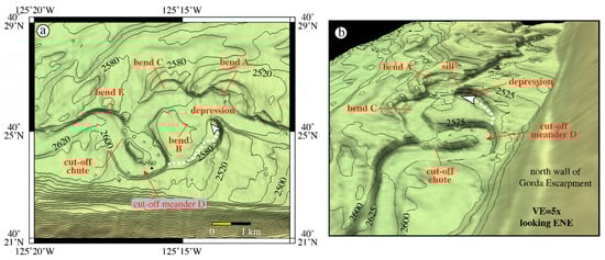 Deep-water sinuous channels are conduits that transport sediments across continental margins and onto abyssal basins, often transporting sands, silts and clays hundreds of kilometers away from the margin. Almost all examples of modern deep-water sinuous channels are found on passive margins and are associated with submarine fans (e.g., [1,2,3,4], among many others). Mendocino Channel, off the U.S. northern California active continental margin (Figure 1 and Figure 2), is one of the few examples (e.g., Reynisdjup Channel off Iceland and Hikurangi Channels off eastern New Zealand) of a modern deep-water sinuous channel that is not associated with a passive margin or a submarine fan although it also has been a conduit of coarse clastic sediments to a deep-sea basin [5]. During the 1984 mapping of the U.S. Exclusive Economic Zone off the western U.S. continental margin [6,7], a 42 km section of the channel was discovered on the abyssal seafloor at the base of the north side of the Gorda Escarpment segment of Mendocino Ridge, a ridge formed by the transform fault that strikes east from Gorda Ridge and beneath the North American continent. The short section of Mendocino Channel was mapped using GLORIA, a long-range sidescan sonar (Figure 3a) and was investigated on a subsequent cruise that collected widely spaced single-channel seismic-reflection profiles and several box cores within the channel and adjacent levee [5]. The GLORIA sidescan only provides images of 6.5-kHz backscatter but the images show the high-backscatter acoustic response of the channel floor. Unfortunately, the GLORIA system provided no measurements of bathymetry. The channel, called “Mendocino Channel” by Cacchione et al. [5], was traced on the GLORIA images from water depths of ~2450 m to ~2750 m. They suggested, based on NOAA bathymetric charts, that the channel is related to Mendocino and Mattole Canyons. Mendocino Channel is not in a submarine fan setting with associated sinuous distributary channels, such as are found on many submarine fans [1,2,8,9,10,11,12,13,14,15,16,17,18,19,20] to cite just a few. Rather, Mendocino Channel is a single channel that trends across a debris apron at the base of the lower continental margin and continues across hemipelagic sediments deposited in a basin setting. The most similar channels to Mendocino Channel and its setting are Reynisdjup Channel off Iceland [21] and Hikurangi Channels off eastern New Zealand [22].
