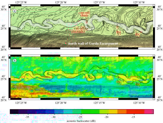 - Cacchione, D.A.; Drake, D.E.; Gardner, J.V. Recent meandering channel at the base of Mendocino Escarpment. In Geology of the U.S. Seafloor: The View from GLORIA; Gardner, J.V., Field, M.E., Twichell, D.C., Eds.; Cambridge University Press: Cambridge, UK, 1996; pp. 181–192. [Google Scholar]