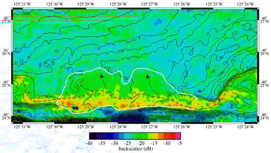 A side channel heads on the eastern summit region of Gorda Escarpment (Figure 8 and Figure 9). The channel was first described by Tréhu et al. [25] and is clearly shown in their seismic data (Figure 4, lines 3, 16 and 24). The new MBES bathymetry shows that the upper side channel does not head in a canyon or even on the margin, but simply appears as a broad shallow swale at the 750 m isobath on a broad high. The first 12.2 km of the upper side channel is relatively straight, but then the channel makes an abrupt series of three near 90° bends before the channel plunges down the north-facing Gorda Escarpment. The upper side channel appears to make yet another 90° bend on a bench about 300 m above the USR floor and traverses east along the bench for another 6.4 km before it enters the USR channel floor at 26.8 km down-channel. At this point, the upper side channel makes an abrupt 120° bend to trend down-channel (west) but no longer can be identified on the MBES bathymetry. However, at the point where the upper side channel enters the USR, the MBES acoustic backscatter abruptly increases from −27 dB to −20 dB and the high backscatter is concentrated along the northern edge of the USR (Figure 9c). From this point on down-channel, the backscatter of the floor of USR spreads out across the channel floor and is consistently between −22 and −20 dB. A 2–5 m high bench occurs on the north side of the channel floor from this point to the end of the reach that reflects sediment from the upper side channel. A large solitary mound sits on the main channel floor at just the point where the side channel reaches the main channel floor (“a” on Figure 8 and Figure 9). The mound has 60 m of relief and basal dimensions of 700 × 940 m.