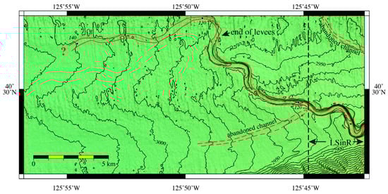 What changed the nature of the reaches from straight to sinuous and back to straight? Typically, major changes of planform characteristics of fluvial channels are the result of changes of sediment load, an increase in peak discharge or a change in channel gradient or some combination of the three [70]. The gradient of the USR decreases from 0.71° at its beginning to 0.12° at the beginning of the USinR. The gradient at the beginning of the LSinR is 0.18° and varies down-channel less than ±0.2° to the end of the reach. Is this small gradient enough to cause a change from linear to sinuous in channel character? Why did the levee heights suddenly decrease in height at two locations? The large north-side levee heights along the USR suddenly decrease from 200 m above the channel floor at 25 km down-channel to 100 m high, about the location where the channel emerges from the steep continental margin, but the change in channel character from the USR to the USinR occurs 41.8 km down-channel where the north and south levees remain less than 100 m above the channel floor. The sudden decreases in north levee heights might reflect the end of continental margin sediment mixed with the north levee sediments. The overall decrease in north and south levee heights in the USR is fairly smooth until the abrupt decrease in height at 22–25.5 km down-channel (Figure 5a). If this is the case, then the sudden decrease in north and south levee heights in the USinR at 62–65 km down-channel must reflect a reduction in the carrying capacity of the turbidity currents and a subtle decrease in channel gradient. The gradient of the channel floor of the USR just before it changes to the USinR is 0.71° and it flattens to 0.12° at the beginning of the USinR. The remainder of the USinR has a gradient of ~0.33° throughout the reach and both north and south levees suddenly end at 60–65 km down channel, 80+ km before the channel is no longer resolved in the bathymetry data. Nothing in the multichannel seismic subsurface data suggests any basement control for these changes.