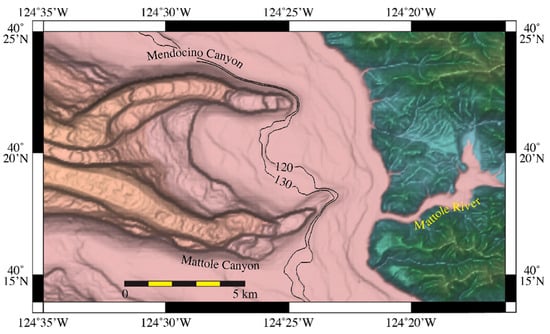 Quaternary episodes of major regressions of eustatic sea levels located river mouths closer to adjacent canyon heads. Marine and ice-core studies have demonstrated that Quaternary eustatic sea levels dropped 120–130 m relative to today’s sea level during maximum global glacial conditions ([59]; see De Boer et al. [60] for discussion and references). The shoreline effect of the glacial eustatic low sea levels at the heads of Mendocino and Mattole Canyons is shown in Figure 16. The mouth of the Mattole River is presently 2.5 km from the head of Mattole Canyon. A 120 m drop in eustatic sea level would have fed the Mattole River directly into the canyon head. A 130 m drop in eustatic sea level would have fed the river farther down the canyon head. The head of Mendocino Canyon is presently 3.2 km offshore the shoreline. A 120 m drop in eustatic sea level would have placed the shoreline 370 m from the head of Mendocino Canyon and a 130 m eustatic lowering would have placed the shoreline an additional 75 m closer to the canyon head. In these instances, there was virtually no shelf between the shoreline and the two canyon heads. The last eustatic low stand occurred about 20 ka, but the youngest turbidite in BX-1, collected within Mendocino Channel, dates at about 0.97 ka and the fifth turbidite in the sequence at 50 cm subbottom in BX-1 is dated at 3.59 ka, so eustatic sea levels could not be the dominant forcing process that generated many of the late stage channel turbidites.