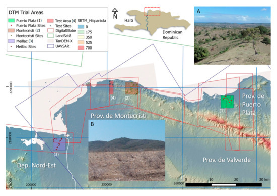 Initially selected trial areas in northern Hispaniola and the available remote sensing data sets superimposed on a modified DEM from JPL/NASA’s Shuttle Radar Topography Mission (SRTM). The small images display the (A) landscape in the Puerto Plata and (B) the view from an archaeological site in the Montecristi region (right). (Datum: WGS84, UTM 19N).