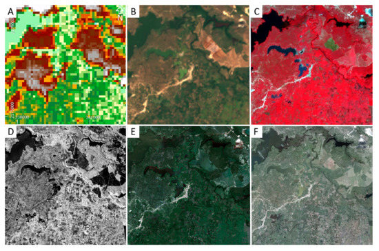 Overview of the initially trialed remote sensing data sets for the region Nordest Haiti. (A) SRTM, (B) LandSat, (C) ASTER, (D) UAVSAR, (E) Worldview-2, (F) Aerial. (Datum: WGS84, UTM 19N).