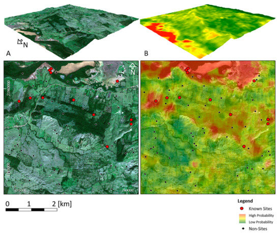 The posterior probability and the frequentist approach are two algorithms developed at Cultural Site Research and Management (CSRM) [21,22] as a Direct Detection Model (DDM), to identify the probability of sites by comparing single pixel values. Both algorithms were modified at the time of the study and ready for use at different times; this is one reason why each was applied on a different trial area. The general idea behind direct detection is that anthropogenic activities at archaeological sites, often over long periods of time, have impacted these parts of the landscape in ways that if they persist are statistically measureable in remote sensing data. The DDM has therefore two sets of input data. The first set has two parts. One is the locations of known archaeological sites. In the trial area of the northwestern Dominican Republic and Haiti, the archaeological “sites” were identified over several years by different archaeologists, mostly with the help of local guides. Each site visited was named, a number of archaeological samples taken, and georeferenced by taking one or more GPS points at the site using a handheld device. In addition the algorithm needs areas, at best also groundtruthed, with presumably no sites, which are equally important for the study. A second data set comprises a variety of remote sensing imagery. The subtle variation between already discovered areas of human activity, the sites, and areas of no human activity (non-sites) within each remote sensing band, can be used to detect difference. The difference is more likely to be detected when many different bands of available satellite or aerial data sets are combined.