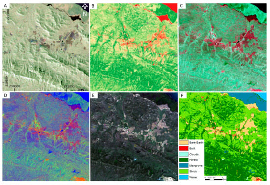 Various combined remote sensing data sets of the Montecristi trial area. (A) UAVSAR Pauli Decomposition. (B) Worldview-2 NDVI. (C) Worldview PCA. (D) Worldview Tasseled Cap. (E) Worldview RGB with rectangles defined for (F) land cover classification. A white cloud can be seen in the lower center of (E). (Datum: WGS84, UTM 19N).