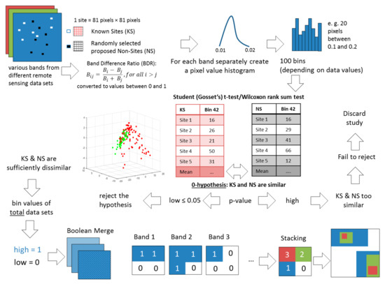 A variety of statistical trial calculations were applied. A band-difference ratio (BDR) was generated among every band included in the algorithm data set, to reduce the dominance of particular, as well as essentially redundant, data sets. These ratios were indices similar to the NDVI and normalized datasets. Only bands with the lowest positive response rate, a low p-value (cause for rejecting the 0-hypothesis that KS and NS were similar) were further considered for the tests. The highly diverse environment, as made visible in the land cover maps, would, one might expect, influence the success of the approach in comparison with other areas where land cover was more homogenous [52].
