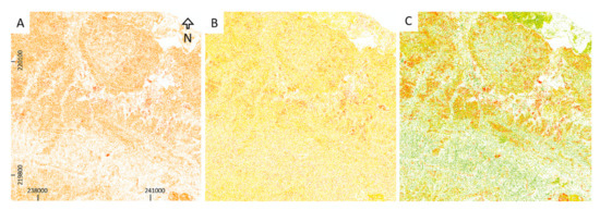Results from the frequentist tests in the Montecristi area, using a total of 28 BDR bands. (A) Sturges rule: highest value after Boolean merge: 2, (B) based on Scott: highest value after Boolean merge: 4, (C) Sturges rule using BDR: highest combination after Boolean merge: 7. (Datum: WGS84, UTM 19N).