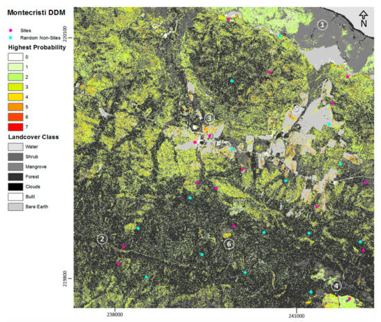From an archaeological interpretative view, the higher values do not necessarily represent an ancient pattern of settlement selection, but a combination of features that seem to be the trend in this particular area. It remains uncertain if the DDM corresponds to areas that follow attributes based on previous [20] and current research that served predictive models [35], a pattern that expresses tendencies, such as proximity to the sea, or other sea features such as mangrove forest, proximity to brooks, proximity to flat lands (usually less forested), and elevation less than 100 m. Modern settlements have been built near areas that combined the aforementioned features, as these also allow the development of crops. The high valued pixels of the DDM show zones in which these features have been combined, and could be a reason to have also highlighted areas of current habitation. For the northern part, the model created seems to correlate with earlier proposed indigenous activity pattern; the question remains why this may be the case. While the topography was not taken in consideration due to the low resolution available for the region, interpreted visually by archaeologists particular areas of no likely habitation coincide to areas of low probability. In the center and south, two known locations (3) are extensive sites on grassland, surrounding a former school yard. Here the high probability results appear to delineate the area of the assemblage of material. Location (4) in the southwest corner seems to pick up a small site near the recently mapped large site of El Manantial (MC-44) [18], only separated by a small gorge. The intensity at location (5) was identified as a modern dump site, while (6) represents the above mentioned small cloud.