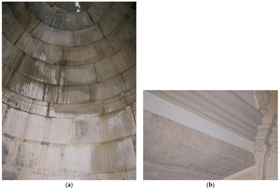 Images illustrative of the indoor space typology: (a) type A spaces, where granite is the dominant material in all the space elements (floor, walls, ceiling); (b) type C spaces, where there are granite applications but other materials are as abundant as or more abundant than granite.