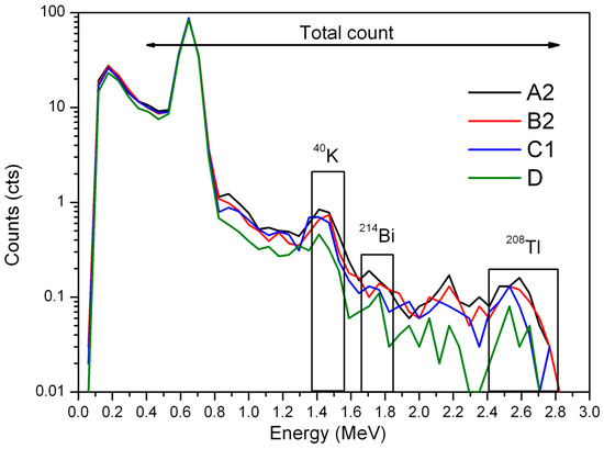 Recorded spectra for measurements A2, B2, C1, and D with indication of the emission bands of 40K (1.461 MeV), 214Bi (1.764 MeV), which is used for the estimation of “equivalent of uranium” or eU, and 208Tl (2.615 MeV), which is used for the estimation of “equivalent of thorium” or eTh, with the corresponding peaks and total count energy range used for obtaining dose rates.