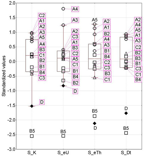 Box-and-whisker plot (with discrimination of individual values) of standardized estimations from portable gamma spectrometry.