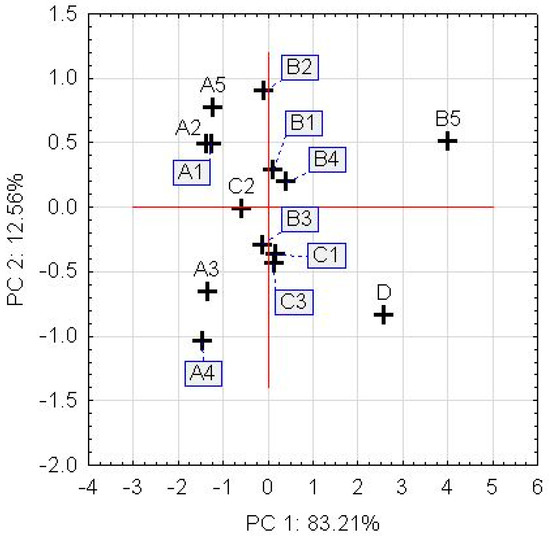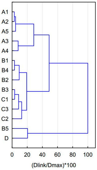 As is illustrated by the dendrogram presented in Figure 4, where the separation of clusters can be observed at several levels, all of the considered hierarchical cluster analyses that were tested joined spectra D and B5 in a cluster separated from all others spectra results. Both Ward’s method and UPGMA (or unweighted pair-group average) joined all spectra of type A locals in a “cluster” separated from the remaining measurements (B and C). Some distance measurements (e.g., the Euclidean distance) also joined in a cluster measurements B1, B2, and B4, and in another cluster B3 and spectra of type C spaces. Other rules produced different results, which have in common joining A3 and A4 (after the separation of B5 and D) and putting the spectra of other type A spaces in a cluster with the other spectra.