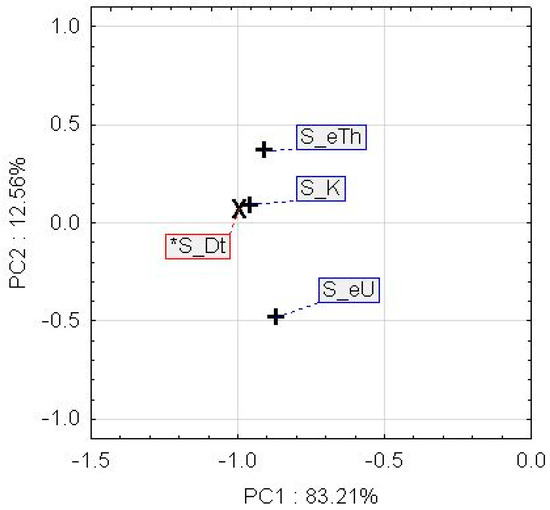 In terms of association with the variables (Figure 6), S_K, S_eU, and S_eTh (this referencing highlights the use of standardized values in PCA) have similar (and negative) weights in PC1. The absorbed dose rate (S_Dt) also has a similar behavior in terms of PC1, being nearer to S_K. PC2 shows almost symmetrical weights for S_eU and S_eTh, while S_K and S_Dt are nearer to zero in this component, suggesting that this component is mostly affected by the influence of the relationship between the two.