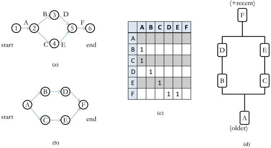 Relative temporal representations: (a) PERT diagram; (b) MPM diagram; (c) Harris matrix; (d) Harris graph.
