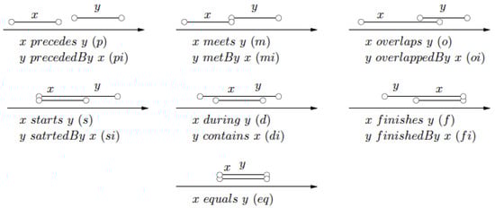 - Allen, J.F. Maintaining knowledge about temporal intervals. Commun. ACM 1983, 26, 832–843. [Google Scholar] [CrossRef]