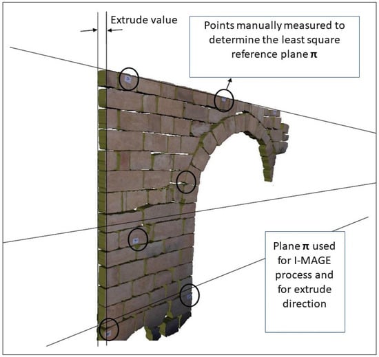 Computing an extrusion vector can be easy when the architectural entity’s morphology is obvious. During a wall survey, for example, an extrusion vector can be computed by a least squares adjustment. This is the plane used by I-MAGE. In this case where the entity’s geometrical properties are simple, the extrusion vector is calculated before the survey phase, and the block is extruded directly from the measured points (see Figure 7 and Figure 8).