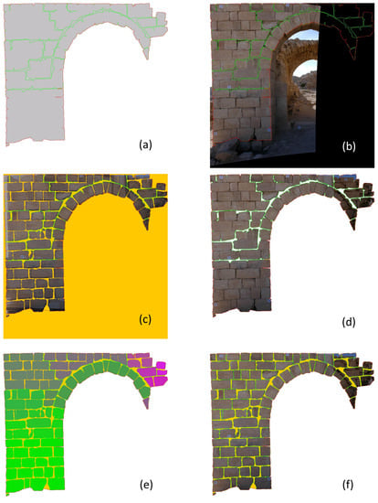 Several orthophoto/map generation images based on several queries: (a) the design of USM perimeters; (b) same as (a) with a reprojection of one of the oriented images; (c) Image (a) with a reprojection of the texture inside the block perimeter; (d) texture reprojection inside of the US perimeter (computed with blocks); (e) Image (a) query with a uniform color inside each block according to their US and an automatic extraction of the cement (computed as the Boolean difference between the global perimeter of all US and all the individual blocks); (f) the same as (e), but with texture mapping for each block.