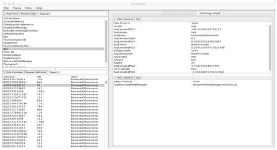 The first one is an editor that displays classes, instances and properties present in an ABox (a set of assertional axioms in an ontology) as if the data were structured by a table in a relational database (see Figure 11). By reading the ABox, the editor is able to display the classes present in the ontology, all their instances and offers a simple and dynamic way to display data properties as normal fields of these instances and the possibility to modify them (also, as we are in the ontology context, to add or remove fields). This of course gives us many other possibilities as the archaeological work is always in progress, and a modification of the data structure is always possible and easy to implement through this interface.