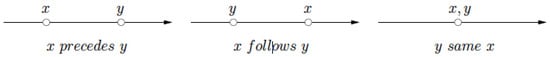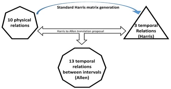 Since the 1990s, a new trend has been developing and proposes to use other temporal models in archeology to take this complexity into account. Ann Ramenofsky, an archaeologist at the University of New Mexico, USA, suggests using intervals to take into account measurement uncertainties in absolute chronology assessments ([46], p. 79). Other teams propose to extend the temporal relations proposed by Harris to the time management formalism proposed by Allen [46]. This results in the number of temporal relations increasing from 3–13 (see Figure 3), as well as the ability to reason in terms of duration over intervals and no longer on a succession of ordered instants [47,48]. However, even if this formalism is much richer (13 relations are proposed to manage time intervals), this approach has not yet spread in the world of archeology [49].