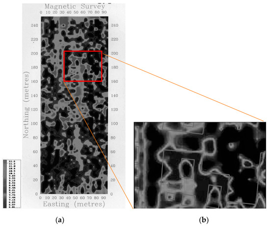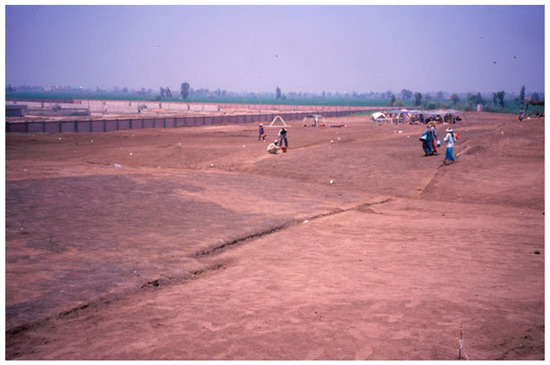 At the sites of Mendes and Tell Tebilla, L. Pavlish conducted magnetometer surveys using a fluxgate gradiometer [22]. These techniques helped to highlight key portions of these sites for archaeological excavation. At Tell Tebilla, the magnetometry survey showed the outline of a complex (Figure 5), later found by excavators to be the remains of a structure reused as a tomb, preserved over seven meters deep. H. Becker and J. Fassbinder have done magnetometry work at Pi-Ramesses, which revealed the outlines of many structures now beneath agricultural fields [23].
