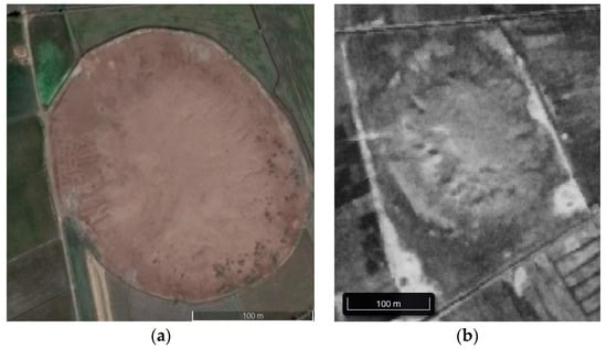 Kom Bunduq: Located in the western Nile Delta, the site measures 240 m × 220 m, and has no vegetation. Some smaller features are visible in a November 2011 image, while others appear in the central part of the tell in a February 2013 image. The site dates to the Late Roman to Islamic Periods (ca. 395–1517 AD) [26] (Figure 10). In the 1968 image, the site appears to have a lower section (similar to sites in Syria or Iraq), now beneath agricultural fields.