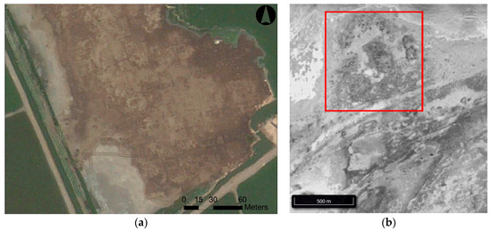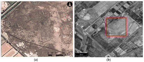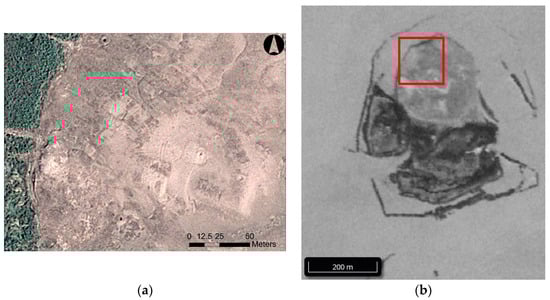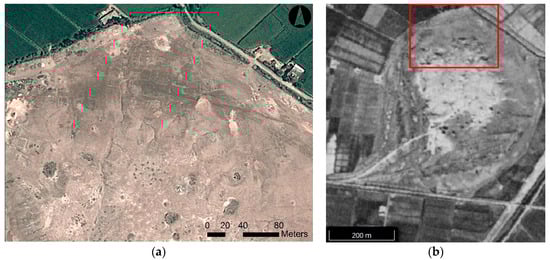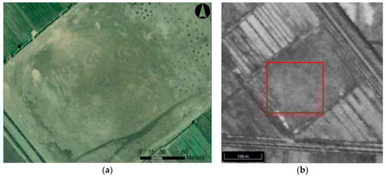 (a) The site of Tell Mutubis. Image courtesy Google Earth; (b) 1968 CORONA image. The area of image (a) is in the red box. Image courtesy of the Center for Advanced Spatial Technologies, University of Arkansas/U.S. Geological Survey.
