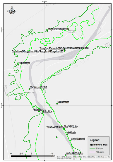 The analysis of contemporary and archival satellite images and archaeological documentations presents the possibility of monitoring the state of archaeological sites in the Near East (for example, Palmyra in Syria). As it will be demonstrated in the case of Upper Egyptian sites, the rapid growth of agricultural lands and settlements can pose a great threat to sites localized on the border of fields and the desert. As a case study, the Qena district was chosen, a region of significance for the history of ancient Egypt. To trace the expansion of agriculture and the development of modern settlements, a synthesis of archival maps (from the last 200 years), and archival and contemporary satellite images was created. By applying map algebra to these documents, it was possible to determine areas which may be marked as “Archaeological Hazard Zones”. The analysis helped to trace the expansion of agricultural areas during the last 200 years and the influence of both—ancient Egyptians and the Nile—on the local landscape.