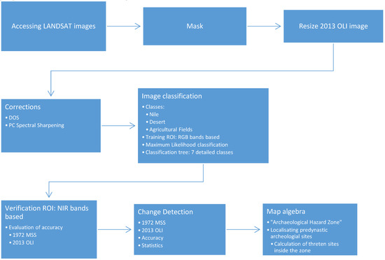 As mentioned above, it was noted that a key threat to archaeological sites in the Upper Egypt area is the development of cultivated lands. The detection of agricultural areas’ changes followed the proposed workflow below (see Figure 2).