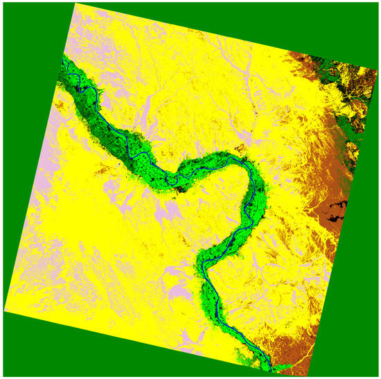 The MSS sensor had a spectral resolution of 0.5–1.1 µm (bands from 4 to 7) and a spatial resolution of 60 m [26]. OLI had a spectral resolution of 0.43–12.5 µm (bands from 1 to 7) and a spatial resolution of 30 m [27]. The next step was to create a mask excluding high desert areas unnecessary for the current purposes of analysis. Subsequently, the image from 2013 was resized to the resolution of the image from 1972. This was necessary for the future analysis’ compatibility. The next step was to process the images without the use of Radiometric Correction. Dark Object Subtraction was used for atmospheric correction. Principal Components (PC) spectra sharpening was also used to receive a better-quality image.