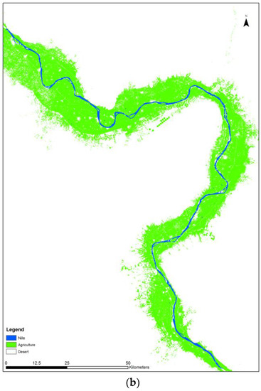 - Xu, Y.; Yu, L.; Zhao, Y.; Feng, D.; Cheng, Y.; Cai, X.; Gong, P. Monitoring cropland changes along the Nile River in Egypt over past three decades (1984–2015) using remote sensing. Int. J. Remote Sens. 2017, 38, 4459–4480. [Google Scholar] [CrossRef]