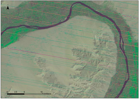 But a problem did appear concerning the LANDSAT MSS 1972 image: the chosen image contained noise, which can be classified as Transient Detector Failure or Band Striping [29]. The noise is visible on bands 5,6, and partly 7. It appears visually as a set of parallel lines crossing the image diagonally (Figure 5). During several consultations, some methods of removing the noise were considered, like destriping or Unstandardized Principal Components Analysis (PCA) [30], but none of them seemed to be a satisfying method for removing the noise visible on the MSS image. However, for the purposes of an analysis aimed at archaeological sites threatened by agriculture, it seems that the noise is only a minor problem.