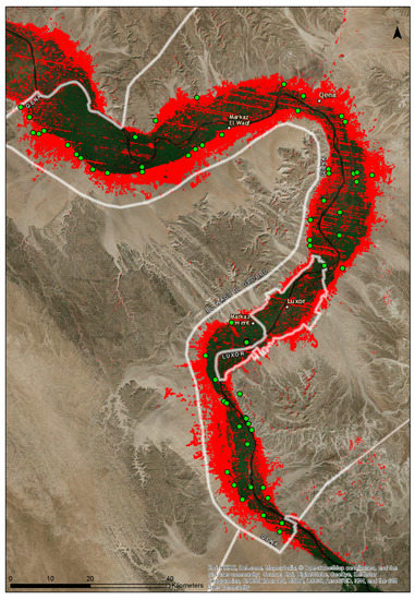 Recently, a number of papers describing change detection in the regions of the Nile Delta and Dakhla Oasis were published [13,14,15,16,17]. Their main focus was to present land degradation, urbanization, and the status of water resources. But the Nile Delta and Dakhla Oasis landscapes, both ancient and contemporary, are completely different from Upper Egypt’s.
