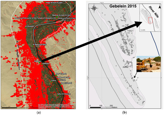 The data described above should be verified in the field, every possibly threatened site should be visited, and the possible destruction of the sites should be examined. The “Archaeological Hazard Zone” and the location of the sites can be imported onto a GNSS (Global Navigation Satellite System) tool with a mobile GIS application with a chosen part ofthe detailed satellite image saved as geoTIFF, and it can be used during field prospection, helping to locate not only the site itself, but also zones of destruction. A similar process took place at the beginning of the Gebelein Archaeological Project. The goal of the research at the Gebelein area (Figure 8) [2,34] is to document archaeological resources and the level of threat caused by modern urbanism and agriculutre, visible on the site complex. Gebelein’s (No. 45 in Table S1) surroundings have changed quite drasticly since the 1800s, from desert to urban and agricultural areas. The site is inside the “Archaeological Hazard Zone” and through the contemporary satellite images it is visiable how agricultural lands spread on the site. A photo-interpretation of archival images from Google Earth dates the biggest change to the period between 2009 and 2013 [2].