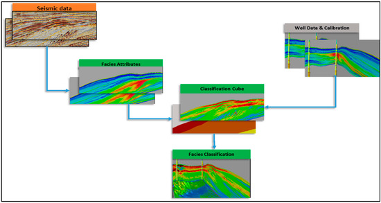Facies classification includes interdisciplinary tasks utilizing data at different scales, such as well-log data and computed properties, as well as geophysical measurements of seismic data. Using well-log data, facies classification defines the facies profile at the well location, which is then extended to inverted seismic attributes. The facies profiles at the well location were used as training data sets to link the inverted seismic attributes to the facies for seismic facies classification. As the SQp and SQs attributes are equivalent to the gamma ray and resistivity logs where the SQp attribute showed a similar motif to the gamma ray log, they can be used in facies classification to replace the well-log data.