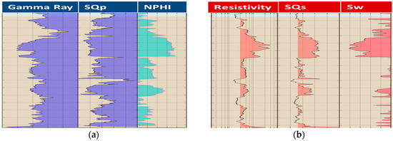 Figure 2. (a) SQp response compared with the gamma ray and neutron porosity log; and (b) SQs response when compared with the resistivity and water saturation log.