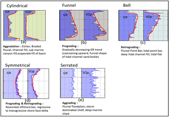 Figure 3. Facies identification in the gamma ray and SQp, the values of GR and SQp increase to the right. (a) Aggradation; (b) Prograding; (c) Retrograding; (d) Prograding & Retrograding; and, (e) Aggrading.