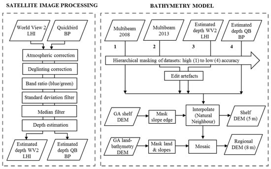 Process diagram of steps undertaken during processing satellite imagery and producing bathymetry model. Geoscience Australia bathymetry grids sourced from [39].