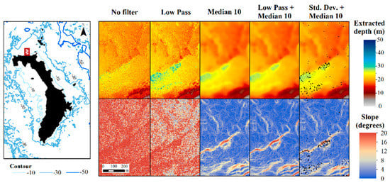 Comparison of bathymetry estimates and calculated slope for selected filters. Black areas for standard deviation and median 10 filter (Std. Dev. + Median 10) denotes “no data” areas.